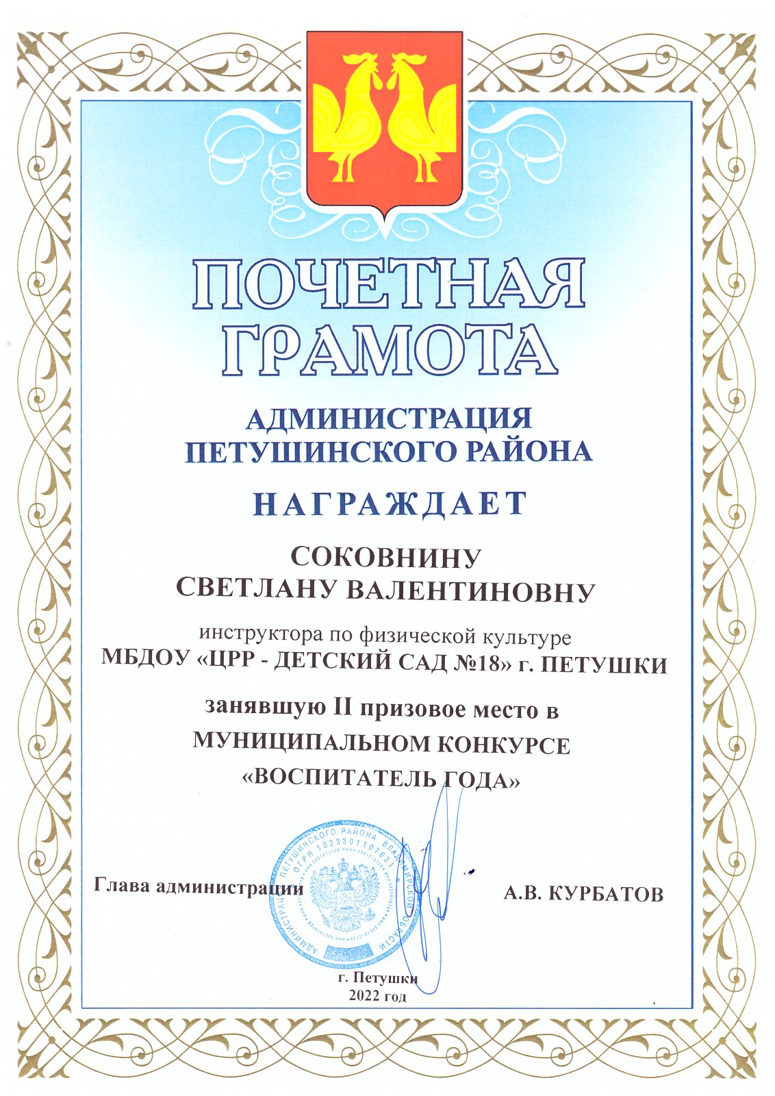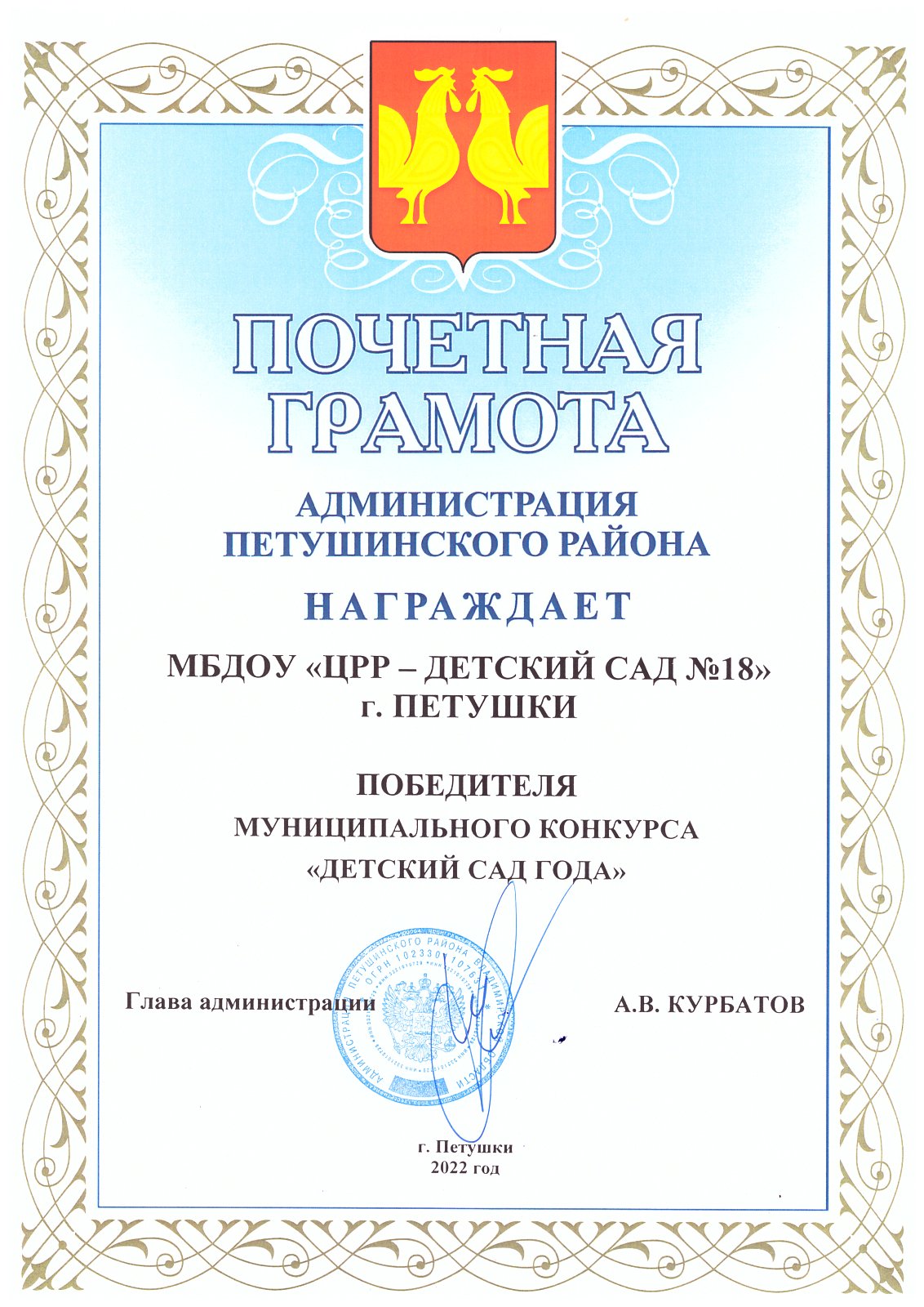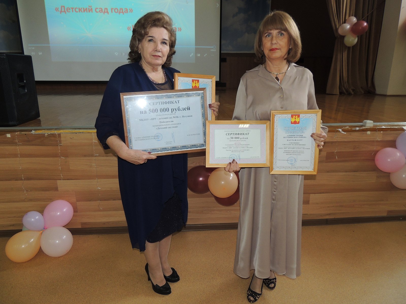 15 апреля состоялась церемония награждения муниципального конкурса "Детский сад года", в котором вышел победителем МБДОУ "ЦРР-детский сад №18" г. Петушки под руководством заведующего Пушкаревой В.Я.