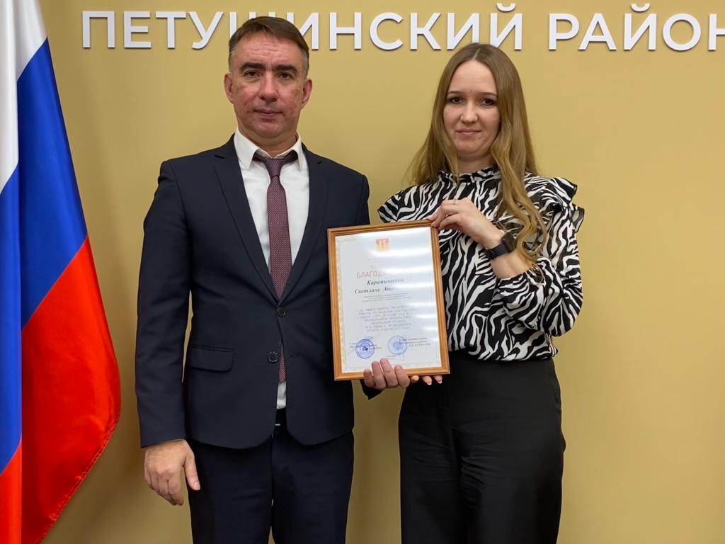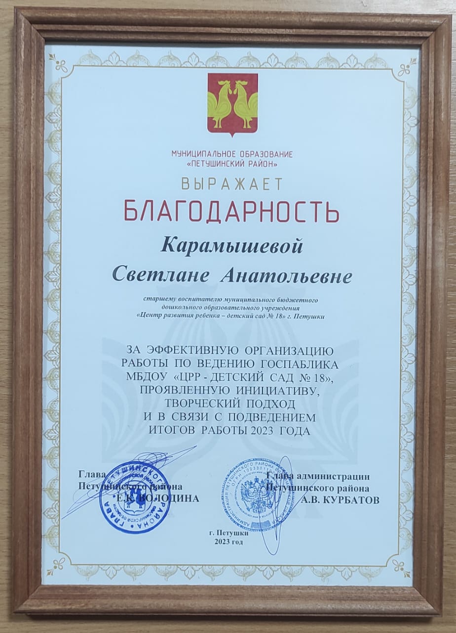 Старший воспитатель Карамышева С.А. была отмечена благодарностью за эффективную организацию работы по ведению госпаблика МБДОУ "ЦРР-детский сад №18", проявленную инициативу, творческий подход.