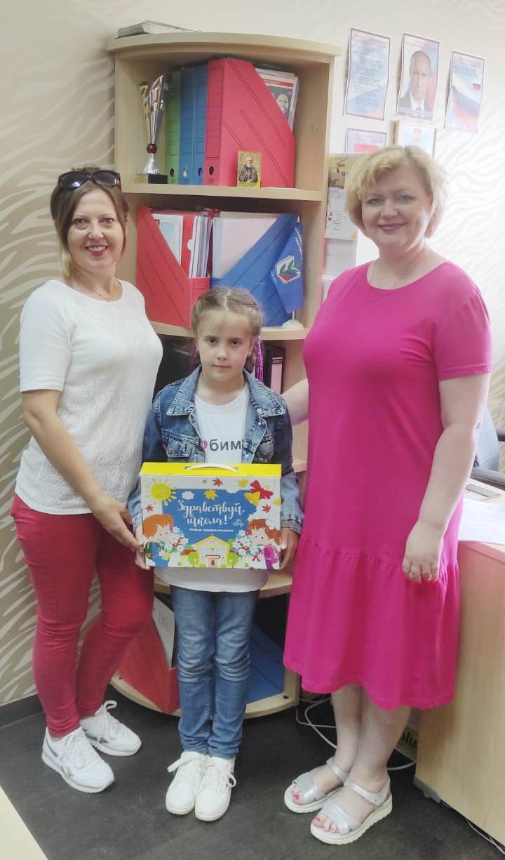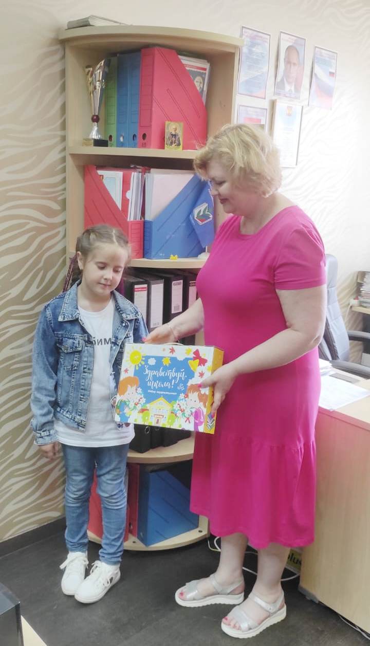 Председатель районной организации профсоюза Н.Н. Матвиишена вручила будущей первокласснице Шумовой Марии подарочный набор для школы.