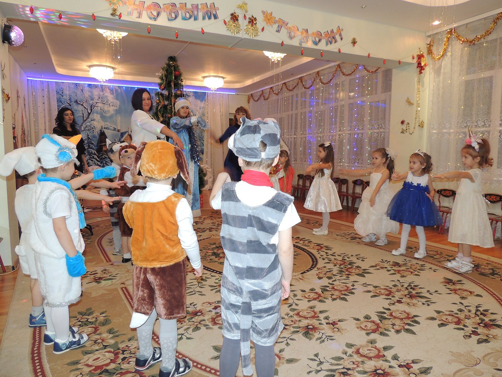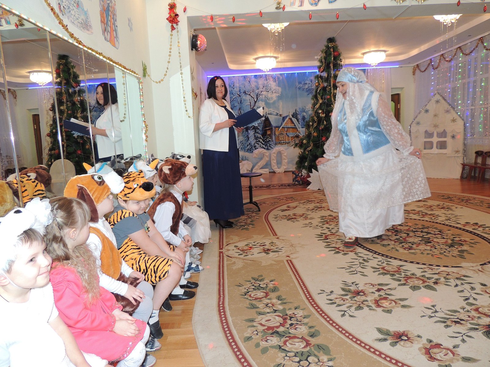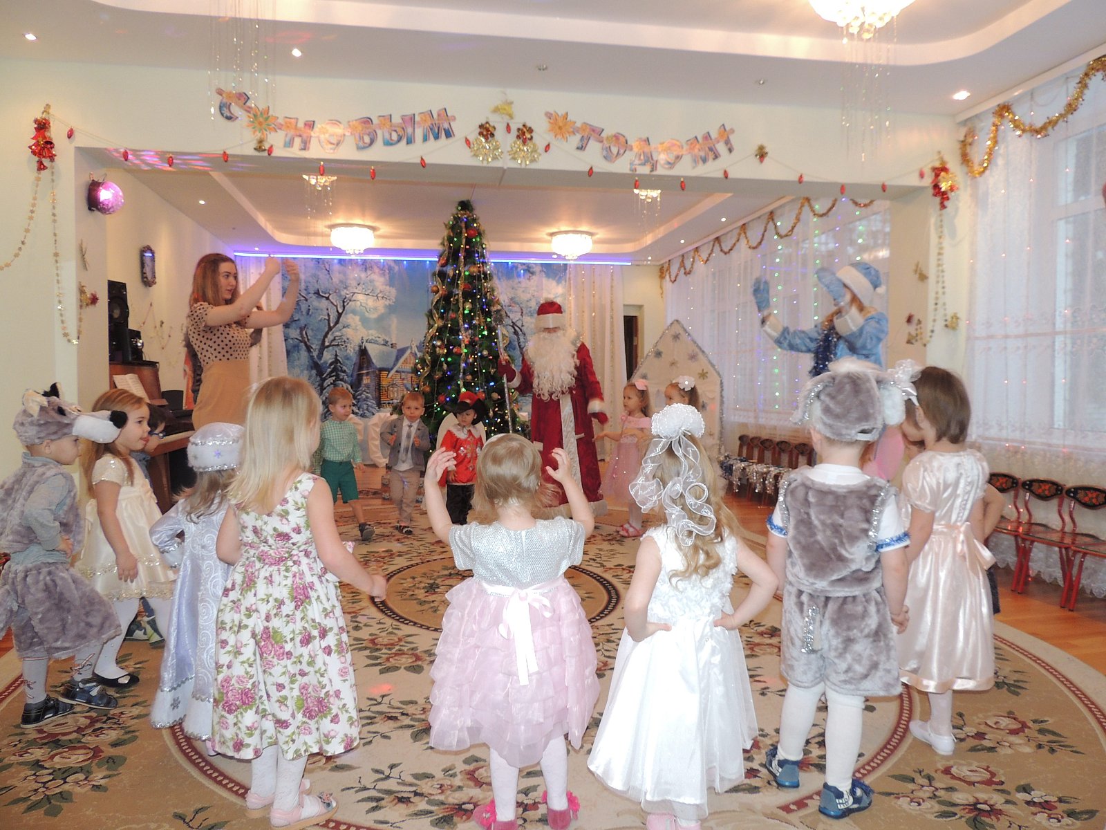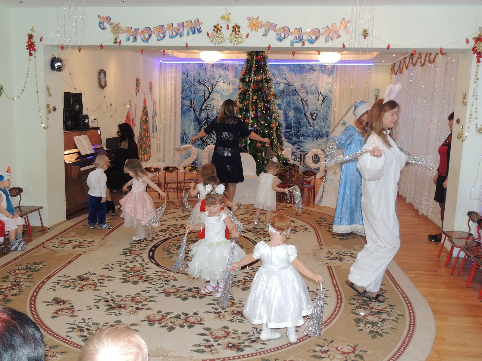 Музыкальный руководитель Гиносян А.Х. пригласила ребят на Новогодние утренники: «Лесные звери в гостях у малышей», «Веселый Новый год», «Разбудим Деда Мороза», «Туристическое агентство Бабы Яги». Дети погрузились в атмосферу волшебной сказки где играли, смеялись, водили хороводы, а также побывали в разных странах.