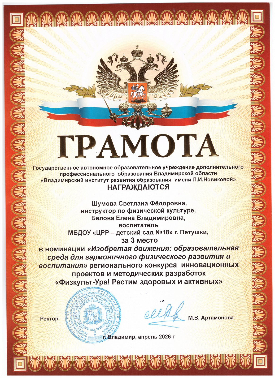 Кульминацией дня стала торжественная церемония награждения победителей престижных региональных конкурсов. Наши педагоги: инструктор по физической культуре Шумова С.Ф. и воспитатель Белова Е.В. приняли участие в конкурсе «Физкульт-Ура!» (растим здоровое поколение!). Они представили работу по теме: «Развитие познавательного и физического развития детей старшего дошкольного возраста через использование интерактивного комплекса «Скалодром» и заняли 3 место.